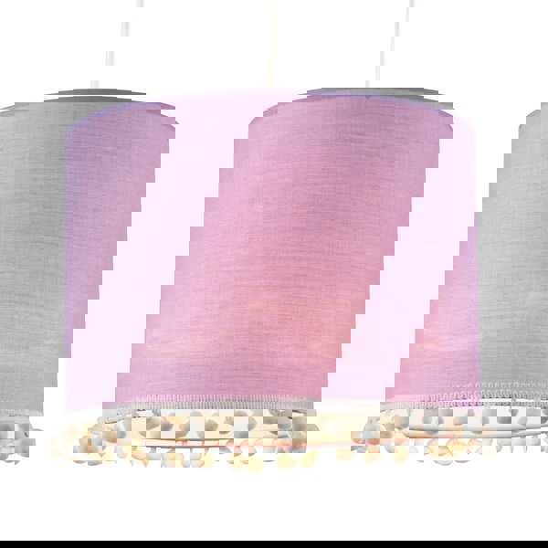 High quality lilac cotton fabric material with eye-catching small white woolly pom-poms.