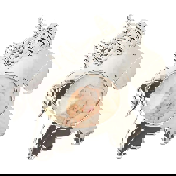 Beautiful standing unicorn shaped compact metal baby picture frame in shiny nickel plated finish.