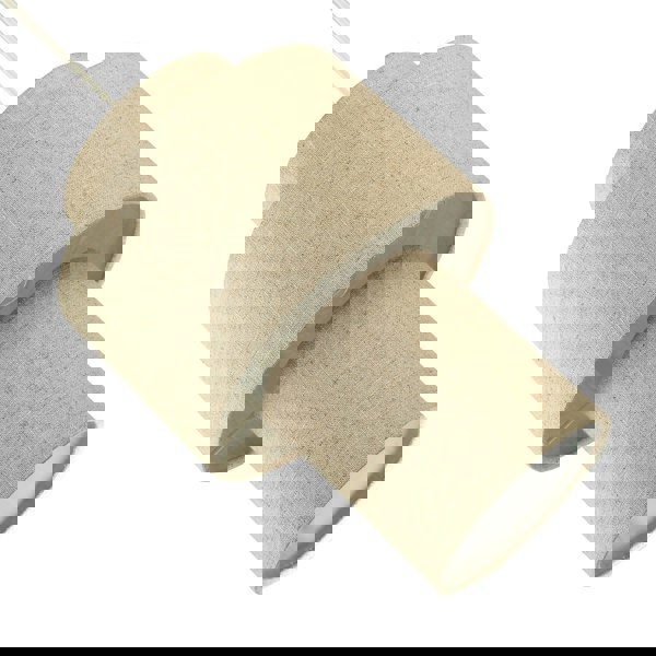 Features three unique layers of different sized interlinked round drum shades in oatmeal beige natural linen fabric.