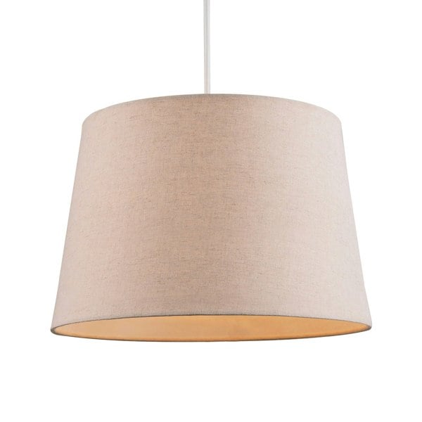 Made of high quality taupe beige naturally textured linen fabric with white gloss metal frame and inner off-white cotton lining giving this shade a very luxurious look and feel.
