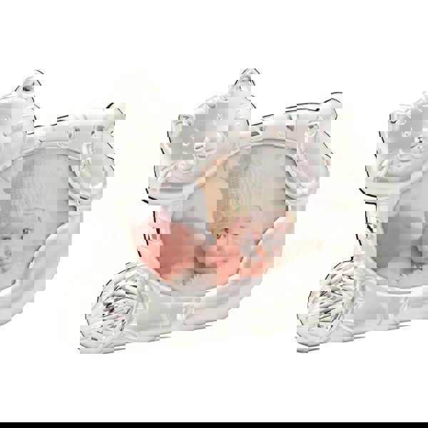 Beautiful smiling cat themed satin silver finish steel metal oval picture frame with string ball decoration.