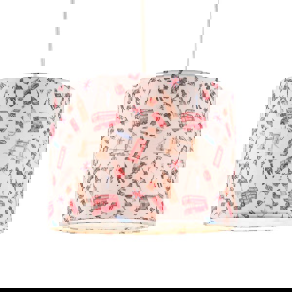 Creative and modern London themed drum lamp shade with traditional red buses, UK flags.