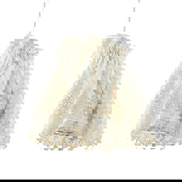 Features unique hanging soft cream cotton fabric with intricate floral lace design creating a beautiful effect when light shines through.