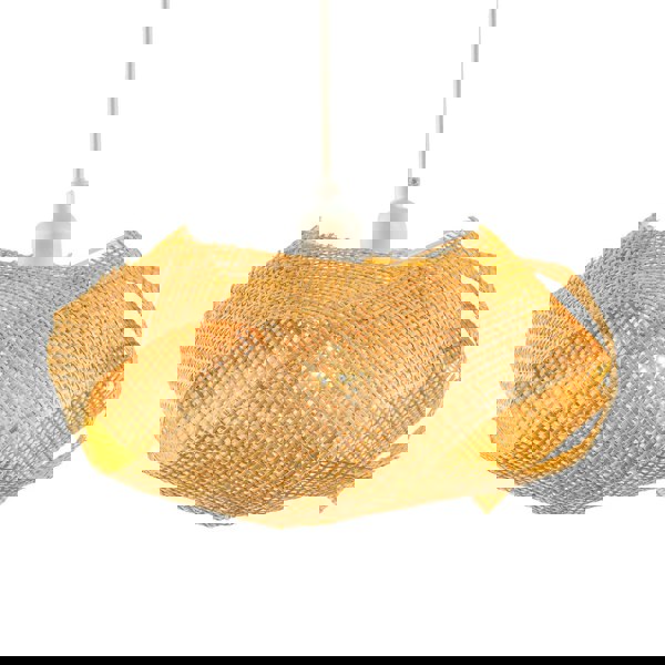 Features natural woven rattan thin strapped round body with a single large strap interlinking creating a modern shape which looks stunning when light shines through.