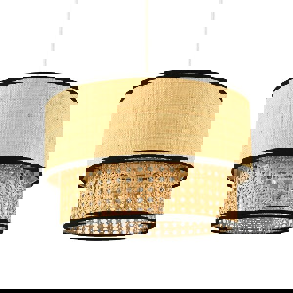 Features double layer real natural rattan material with solid textured upper and hand strapped lower both with contrasting black cotton fabric trims.