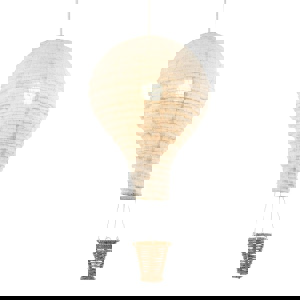 Modern and fun linen fabric pendant lighting shade with hot air balloon design and quirky small hanging basket in vintage wrapped paper.