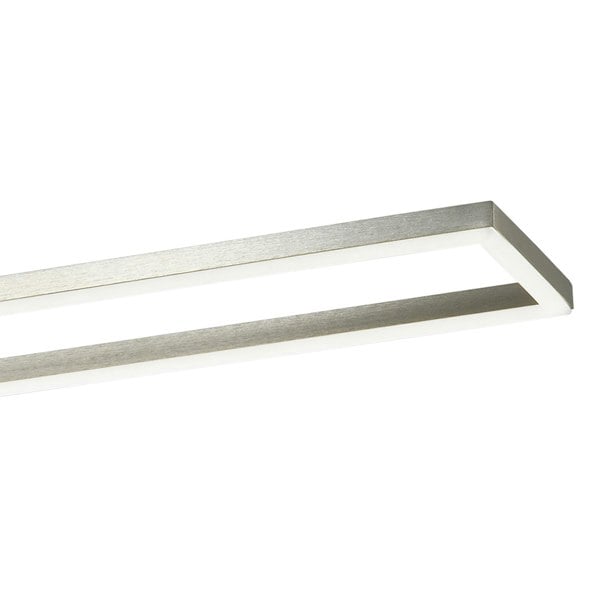 Features sleek thin profile metal strip frame with lower eco-LED light source and surrounding metal fixed to a rectangular base plate.