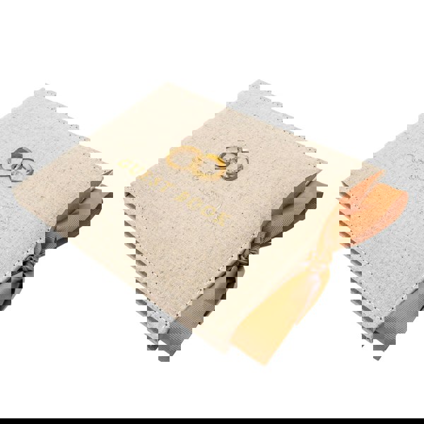 Features wording Guest Book in gold foil with double shiny gold inter-locking rings.