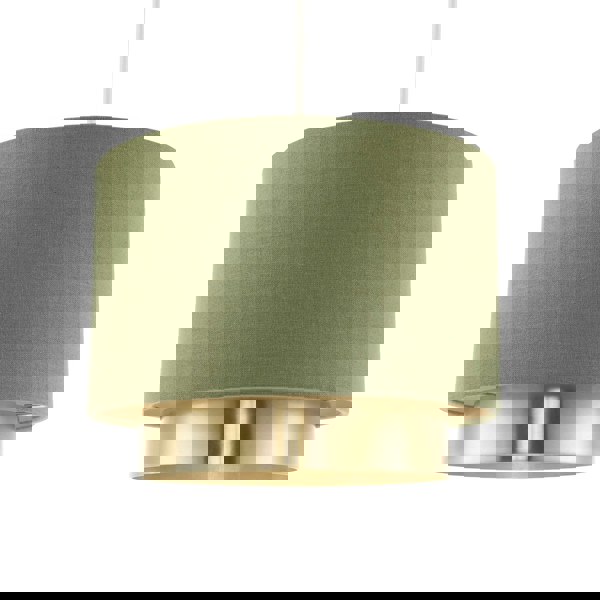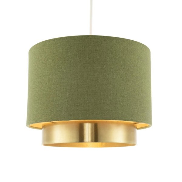 Features sleek dark olive green high-quality linen drum shade with lower brushed gold plated metal ring.