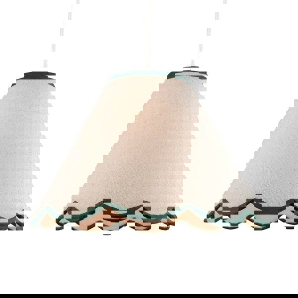 Traditionally designed coolie shaped lamp shade suitable for table or pendant with scallop edge and forest green cotton fabric top and bottom trim.