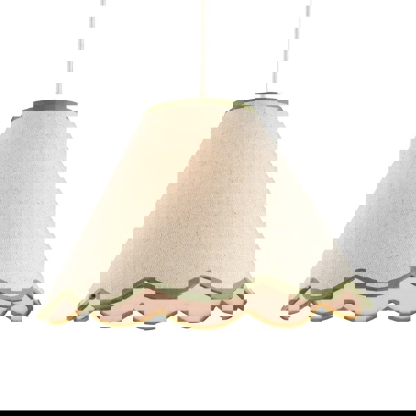 Traditionally designed coolie shaped lamp shade suitable for table or pendant with scallop edge and olive green cotton fabric top and bottom trim.