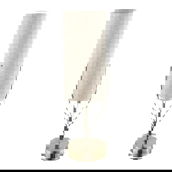 Features a long cylindrical natural oatmeal linen fabric shade which creates a lovely ambient effect when light shines through.