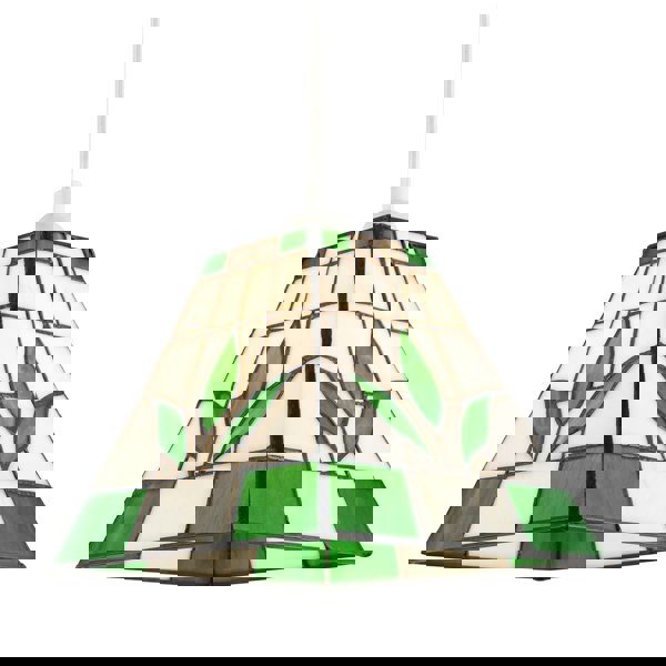 Features green and light amber stained glass panels with subtle leaf floral design on each side.