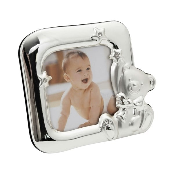 Beautiful square shaped small baby picture frame in two tone satin silver and silver plated highlights.