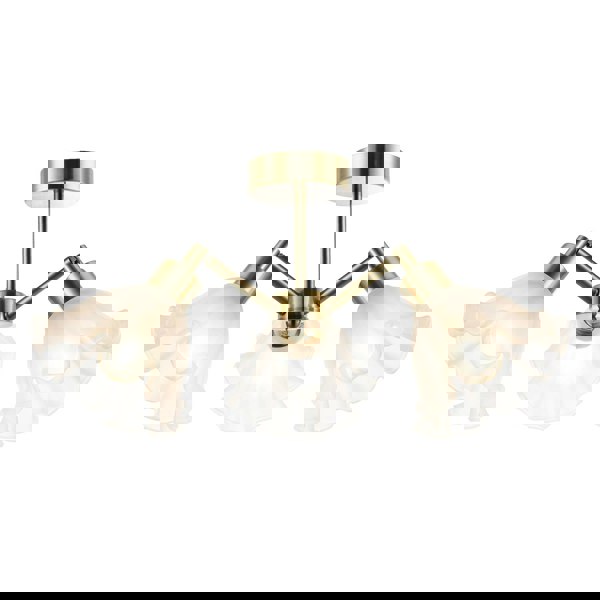 Traditional and classic antique brass plated ceiling light fixture with frosted white fluted glass shades with rippled scallop edges.