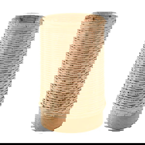 Features an woven natural rattan cylindrical shade which creates a beautiful ambient effect when light shines through.