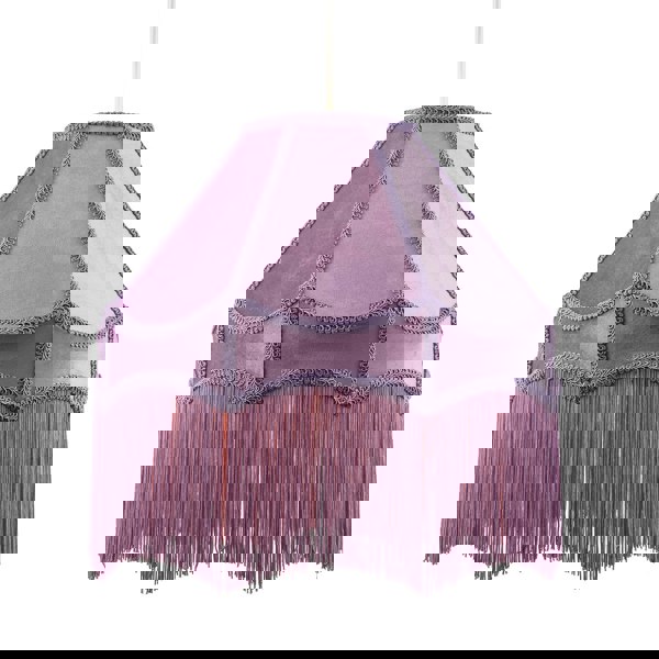 Features soft velvet fabric in soft lilac with matching decorative lower hanging long tassels.