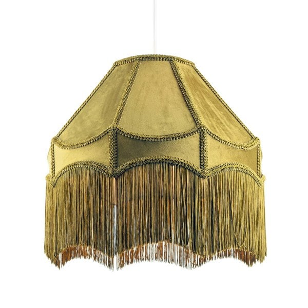 Features soft velvet fabric in olive green with matching decorative lower hanging long tassels.