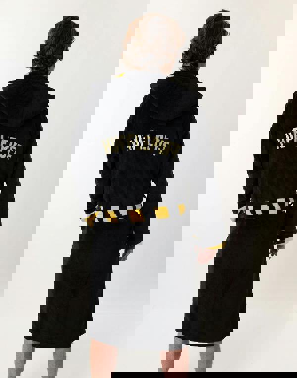 Introducing the Harry Potter Hufflepuff Unisex Black Hooded Bathrobe, designed for fans of the beloved series