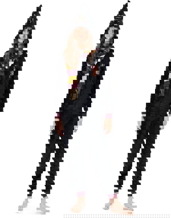 Bring a touch of Hogwarts to downtime with the Harry Potter Gryffindor onesie. Officially licensed, this unisex all-in-one pyjama comes in black to replicate the Gryffindor house uniform gown and scarf, finished with a wizard hat-shaped hood. Embroidered details add character, including Harry Potter glasses and his scar.