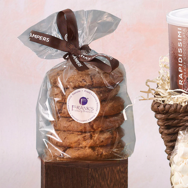 Get creative and indulge in your ideal hot chocolate heaven, with this luxury cosy gift hamper. Snuggle up by the fire and choose between a hot chocolate bomb and delightful drinking chocolate, adding in mini marshmallows, and a scoop of clotted cream to finish it off. Also included, double chocolate biscuits and chocolate oat biscuits, perfect for dunking. To finish a bar of milk chocolate and chocolate pralines too!