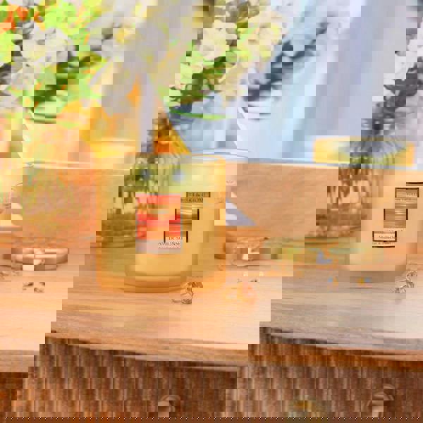 The scent blends sparkling orange zest and fresh neroli blossom with the honeyed richness of sweet amber, creating an elegant atmosphere for everyday unwinding or relaxed entertaining. Two natural cotton wicks are designed to deliver a clean burn for up to 40 hours, while the fragrance-rich, vegan friendly signature soy blend wax is renewable, sustainable, and kinder to the environment. Finished with an intricately detailed, embossed gold lid, it remains a stylish accent even when not in use, making it a thoughtful gift to give or receive.