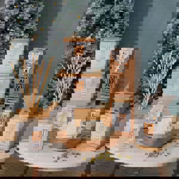 From Heart & Home, the Frozen Woodland Walk Bamboo Large Candle brings a contemporary touch to your space, combining boutique styling with a considered fragrance experience. Vegan friendly and hand-poured, it features pure white soy wax infused with natural essential oils, set in a white frosted glass design. Responsibly sourced wooden wicks add a subtle crackle as it burns, creating an atmospheric backdrop for evenings at home.
