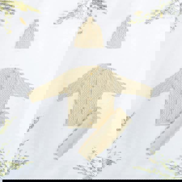 Designed as a thoughtful present for a special new arrival, the Hello Baby Gender Neutral Gift Set brings together a practical outfit and keepsakes to mark those early milestones. Made from 100% pure organic cotton (GOTS certified), the clothing set is created for everyday comfort, with a knitted cardigan featuring a classic criss-cross pattern and wooden buttons, plus coordinating trousers and a matching hat.