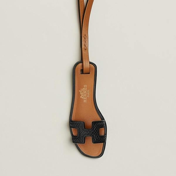 Designed in elegant tan and black tones, the miniature sandal features the house’s signature H-cut detail, faithfully echoing the full-size Oran silhouette. The Hermès logo is stamped on the insole, adding a subtle yet unmistakable mark of authenticity and prestige.