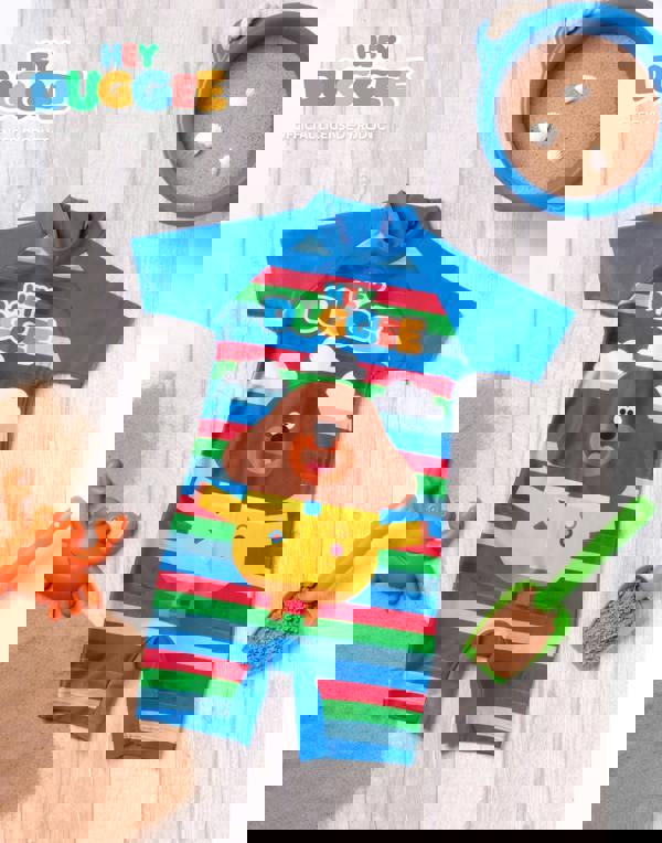 Get your little one's ready to splash around in Hey Duggee style with this awesome Hey Duggee swimsuit for kids; it is perfect for making more Hey Duggee fun on their holiday adventures, enjoying swimming, beach and pool days whilst keeping them sunsafe! The Hey Duggee swimming costume for boys features everyone's favourite huggable pooch, Hey Duggee with open arms ready to swim with clouds and the official Hey Duggee logo contrasted on the colourful striped swimming cossie making a must have Hey Duggee swimwear outfit for summer