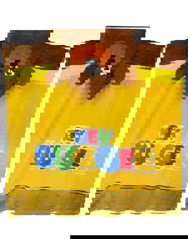 Keep your little ones warm and dry in Hey Duggee style with this super soft unisex poncho towel; it is perfect for making more fun on their holiday adventures, bath time, swimming lessons, beach and pools days whilst keeping them super comfortable! The friendly dog Duggee bathrobe for kids features Hey Duggee's t-shirt as seen in the kids animated TV series finished with Hey Duggee's character face with super cool 3D ears on the hood, ensuring your little ones feel like a real-life Squirrel Club member.