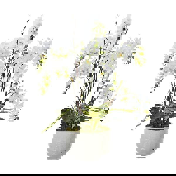 Designed by Hill Interiors, the Ceramic Orchid Flower Pot is a clean, decorative planter for displaying orchids and other small plants. Finished in white, it brings a calm, considered look to shelves, windowsills or side tables, while the textured surface adds subtle detail up close. A sculpted leaves-and-stem motif completes the design, giving the piece a botanical feel that suits both contemporary and classic interiors.