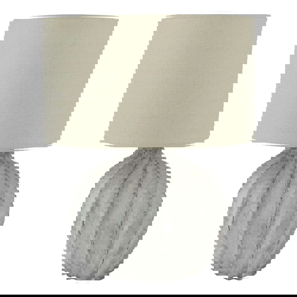 The Darcy Antique White Flute Lamp is a Table Lamp designed to bring rustic character to side tables, bedside units or desks. It features a distinctive pumpkin-shaped base with pronounced ribbing, creating a textured look that adds visual interest to your space.