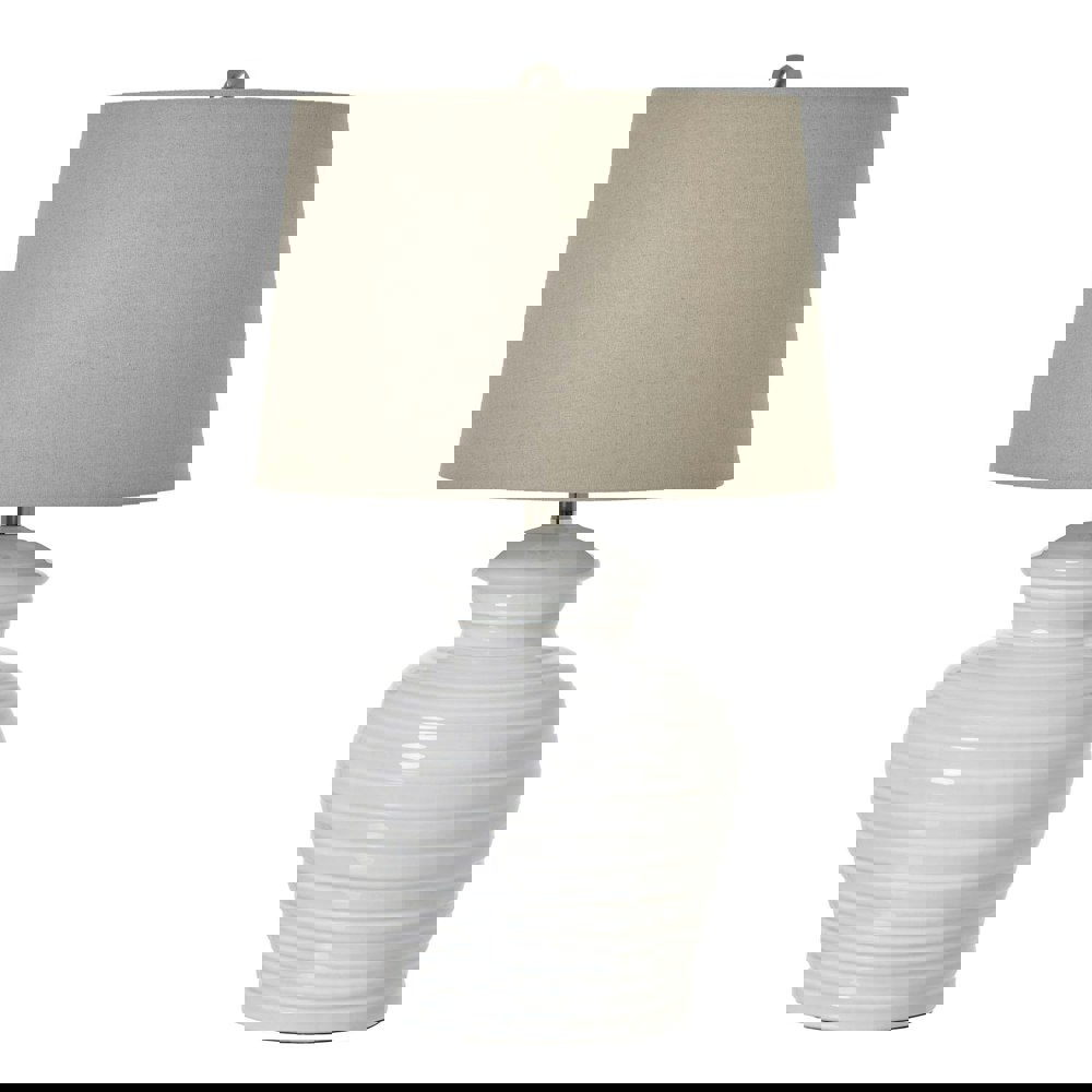 This Ceramic Table Lamp pairs a ribbed ceramic pot base with a linen shade for a clean, considered look that suits a wide range of interiors. The horizontal ribbed design adds subtle texture, helping the lamp stand out on a bedside table, console or side table without overwhelming the space.