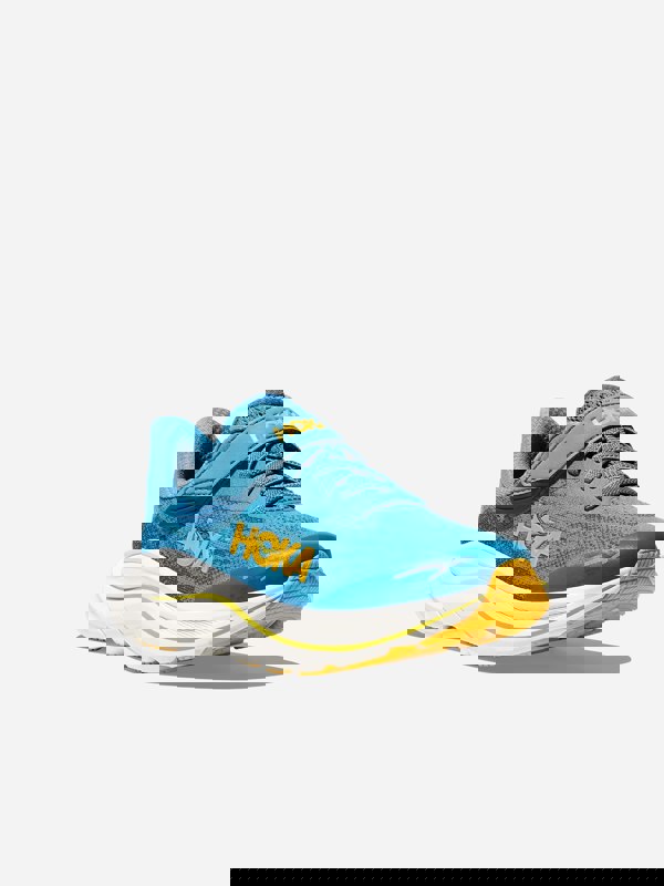 These HOKA Kids Clifton 10 trainers come in an Alpine Blue and Foggy Night colourway. Made from a blend of textile and synthetic materials, they offer a lightweight feel with cushioning and a supportive fit.