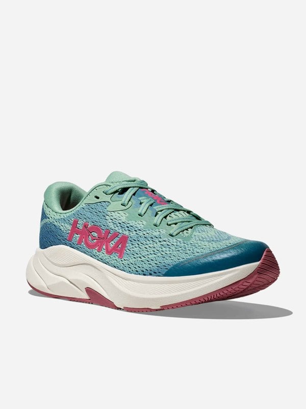 HOKA Kids Rincon 4 trainers in blue with a mesh upper and a rubber sole. Breathable air mesh uses 100% recycled yarns, paired with 96% PET linings and a vegan construction. A TPU toe cap and heel add structure, while the toe cap is specified as durable.