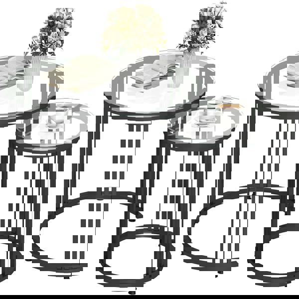 Double the elegant touch for your home. Two black-coloured cut-out tables make this HOMCOM nesting set - creating a beautiful resting place or centrepiece for any space. Made from carbon steel, the frames are very strong and supportive, with sleek tempered glass tops for a safe and reliable resting place. The nesting design means you can use the tables separately, or combine together for extended holding space in the same spot.