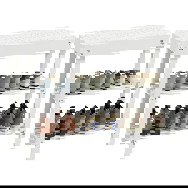 The beautiful way to hold footwear and give you a place to change - this HOMCOM small shoe bench. It's made from bamboo for a strong and beautiful structure - leave it how it is, or customise to your liking. With two slatted shelves there's room for six footwear pairs - be it shoes, boots, heels or trainers. And thanks to the flat top, you also have a place to sit.