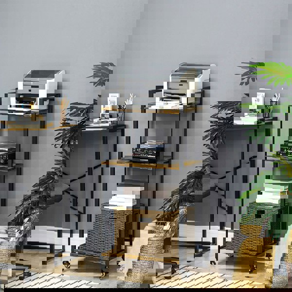 This utility cart is compact and ideal for small spaces needing a bit more storage. 3-tier shelf provides lots of space for supplies and accessories. Armed with pull handles for smooth moving. Easy-roll wheels allow you to move wherever it is needed most, and the wood-grain effect shelf is cool and trendy, great in modern or industrial office. The cart can also be used as a file cabinet, microwave stand, bar cart or kitchen trolley.