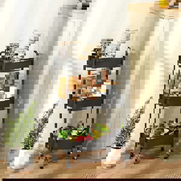 For wherever you need that touch extra holding space, look to this HOMCOM three-tier trolley. This rolling cart comes with a small, medium and large basket - there's plenty of open storage to hold and organise whatever you need, across the home. As a drinks trolley—laundry storage—make-up cart and so much more. Made from steel, this is a tough piece