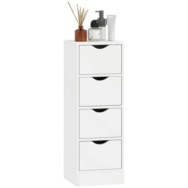 Four drawers provide a dedicated place for toiletries, towels and cosmetics, helping to keep surfaces clear and routines running smoothly. Groove handles allow each drawer to open with ease while supporting ventilation, and the slim, freestanding form makes it a considered choice for tighter corners. Built from particle board, it is supplied with anti-tip hardware to help prevent toppling.