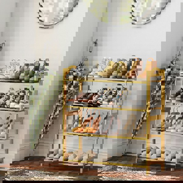 Bring natural charm and everyday practicality into your home with this HOMCOM bamboo shelving unit. Featuring a sleek, four-tier design with a step-style layout, it holds up to 12 pairs of shoes and is also suitable for holding accessories, bags, baskets, or decorative items. With a solid frame and water-resistant finish, it's easy to clean and blends effortlessly into modern interiors - great for entryways, bedrooms or living rooms.