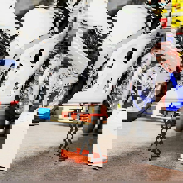 The steel scissor lifting arms with five-position safety pin and support saddles ensures your bike stays secure, reducing the risk of accidents.