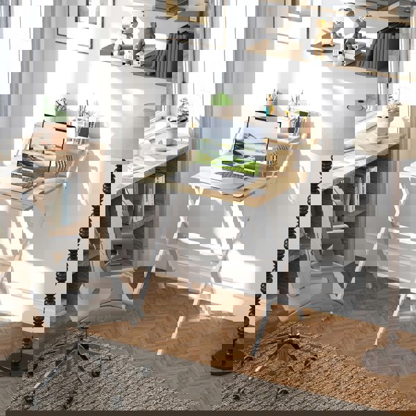 Meet your new workspace superhero—the small computer desk from HOMCOM, a true space-saver for your home office or study area. This compact study desk transformes any nook into a practical workspace. When you're done conquering your to-do list, simply fold it away—out of sight, but never out of style. The top shelf doubles as a handy monitor stand or storage space while the sleek X-shaped frame ensures stability. Unfold productivity, fold away the mess—upgrade your workspace today.