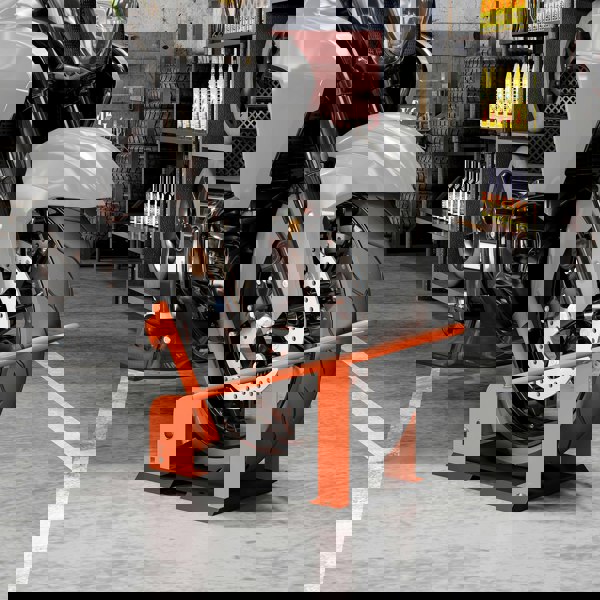 Rev up your bike's security with the HOMCOM Motorcycle Wheel Chock! Designed to snugly fit motorcycle wheels from 76.2-203.2 mm wide and 381-533.4 mm in diameter, this chock adjusts to three different heights, accommodating various bikes effortlessly.