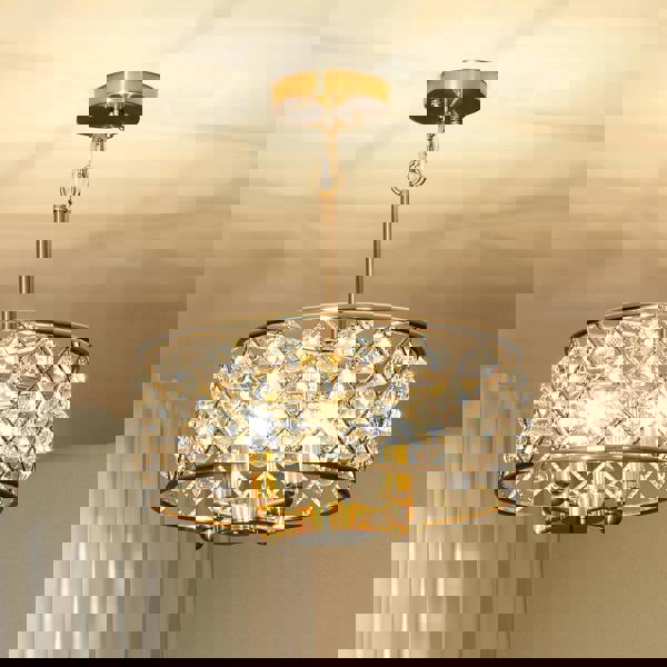 A bright, sparkling home with this HOMCOM chandelier. With 51 crystallite balls and four bulb heads, plenty of light shines through and sparkles. The 130 cm chain is adjustable, so you can have the light hanging at the length you want.