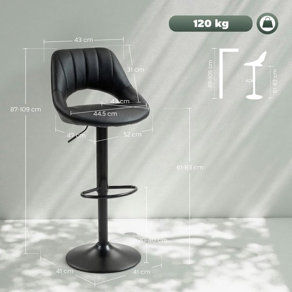 A splash of style to your kitchen or bar area, with these two HOMCOM bar stools. Adjust the height between 87-109 cm to sit at the position you want, with the 360° swivel movement allowing you to swing left-right easily. Filled with 8 cm foam, these stools are comfortable and the faux leather upholstery is smooth and cool. Both are complete with a handy footrest on the bottom of the steel frame.