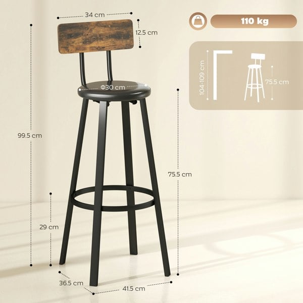 There's no sacrifice on style and comfort with these two HOMCOM bar stools. They come in an industrial-style design: black metal frames with a dark wood-effect back panel: striking and cool - they'll look great in your space. The tall design makes them suitable for 104–109 cm countertops and kitchen islands. The seats are filled with high-density sponge for comfort, finished with a footrest on the metal frames to rest your legs and feet.