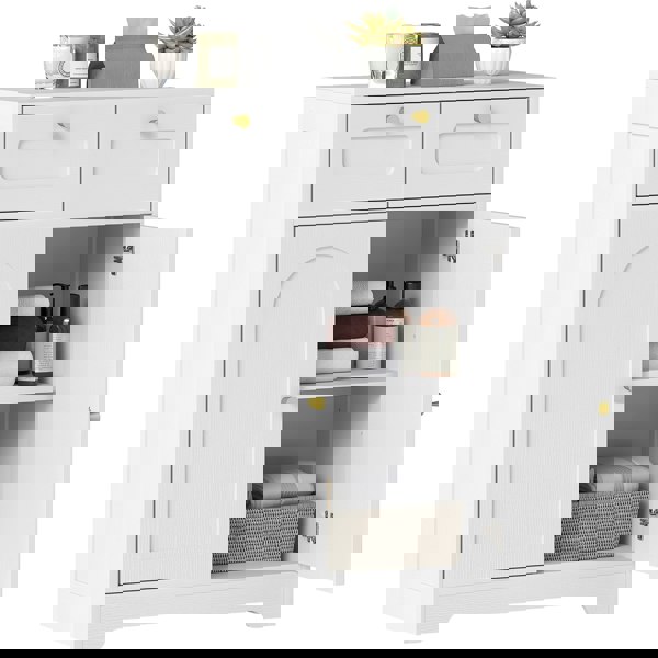 Bring calm and order to your bathroom with this stylish floor cabinet from HOMCOM. Whether it's storing spare towels, skincare, or cleaning essentials, the mix of drawers and a roomy cupboard keeps everything tucked neatly away. The adjustable shelf makes it easy to fit taller bottles, while the strong build supports up to 55 kg—great for daily family use. Finished in soft white with arched doors and gold-tone touches, the bathroom storage unit adds a gentle, classic charm to your space.