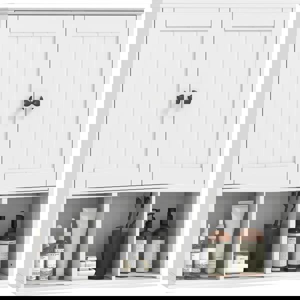 Discover the charm of farmhouse elegance with the HOMCOM bathroom wall cabinet. Its beadboard doors and classic detailing add a timeless touch, while the flexible storage options, including a double-door cabinet, three open compartments and an adjustable shelf, keep your essentials tidy and accessible. Mount the storage cupboard on the wall to save space and bring structured grace to your bathroom.